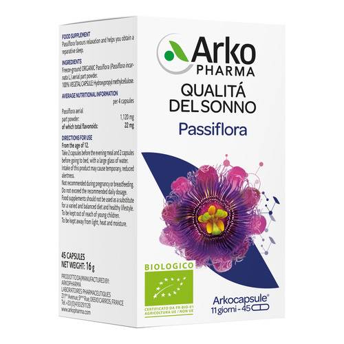PASSIFLORA BIO ARKOCAPSULE Descrizione Integratore alimentare a base di passiflora. Favorisce il rilassamento ed aiuta a ottenere un sonno riparatore. Indicato per vegani. Ingredienti Polvere criofrantumata della parte aerea di passiflora* (Passiflora incarnata L.) bio; capsula di origine vegetale: idrossipropilmetilcellulosa. *Ottenuta a partire da una pianta titolata all’1,5% minimo in flavonoidi totali (espressi in vitexina). Caratteristiche nutrizionali Valori medi per 4 capsule Polvere della parte aerea di passiflora 1.120 mg Modalità d'uso Riservato agli adulti e ai bambini sopra i 12 anni. 2 Arkocapsu...