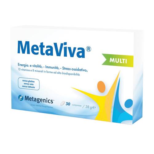 MetaVivaMULTI Descrizione Integratore alimentare per adulti contenente minerali in forme di facile assorbimento. Queste forme garantiscono una elevata tollerabilità gastrointestinale. Inoltre, MetaViva® contiene anche le vitamine in forma attiva: non necessitano una trasformazione e sono direttamente disponibili all’azione nell’organismo. Ingredienti Glicerofosfato di magnesio, vitamina C (ascorbato di calcio); agenti di carica: cellulosa microcristallina, idrossipropilcellulosa; agente antiagglomerante: acido stearico; vitamina E (acetato di D-alfa-tocoferile, tocoferoli misti), bisglicinato di zinco, acido alfalipoico, coenzima Q10,...