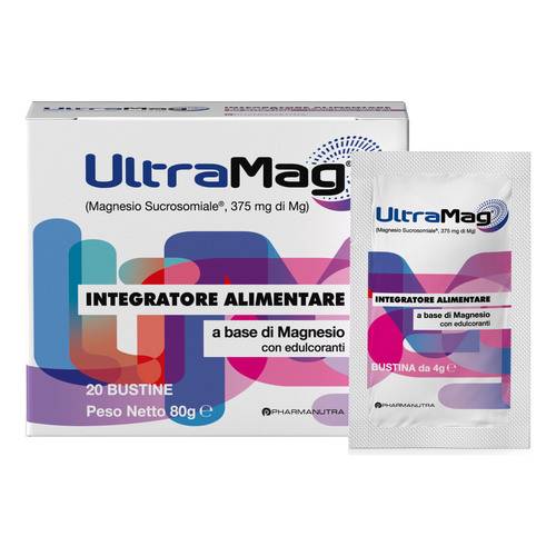 UltraMagDescrizione Integratore alimentare a base di magnesio, utile per colmare le carenze alimentari o gli aumentati fabbisogni organici di questo nutriente. Il magnesio contribuisce alla riduzione di stanchezza e affaticamento, all’equilibrio elettrolitico, al normale metabolismo energetico, al normale funzionamento del sistema nervoso, alla normale funzione muscolare, alla normale sintesi proteica, alla normale funzione psicologica, al mantenimento di ossa normali, al mantenimento di denti normali. Ingredienti Maltodestrine, UltraMag-Magnesio Sucrosomiale (magnesio ossido, amido di riso pre-gelatinizzato, esteri di saccarosio d...
